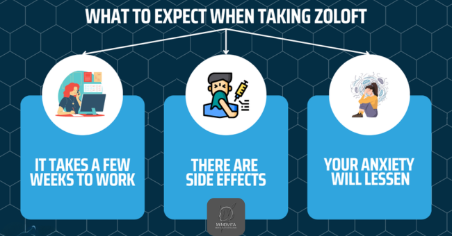 The other advantage of taking Zoloft is the gradual onset of action. Unlike immediate relievers, as in the case of benzodiazepines it takes some time for Zoloft to adjust the serotonin levels to provide relief. Being patient and not expecting any immediate results is a must since it may take up to 2 to 4 weeks before you realize significant changes regarding your anxiety symptoms.
