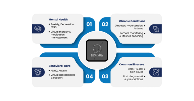 MindVita proudly presents innovative telepsychiatry services allowing you to take care of your mental health from the comforts of your home. Be it anxiety or depression or any other type of mental health issue online psychiatry is an invaluable tool in making sure that one never struggles in life alone.